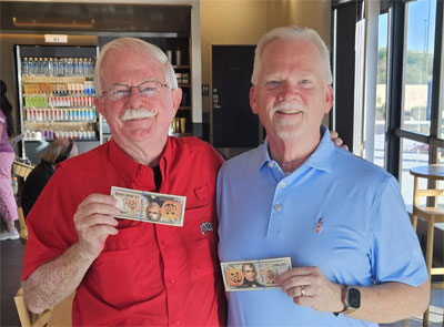 As all of you know, Halloween was last Friday. I had a blast handing these out throughout the week. Phil, a good buddy from Oklahoma was in town, and we met at Starbucks. We asked an African-American guy if he would take our photo and he was happy to do it. I gave him a million dollars and told him the gospel was on the back. He liked it. Here is the photo he took of Phil and me……..