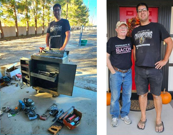 I wanted to share a couple of photos of me and Adam, one of the young men who came through my Boy Scout troop years ago. Today he’s serving in the United States Air Force as a jet-engine mechanic, and when he’s discharged next year, he plans to work on commercial jets. My dad was a heavy-duty mechanic/welder and left behind an incredible collection of professional tools—Snap-on, Proto, Cromwell, and more—so I recently had Adam come over and look through them. He ended up taking most of what he’ll need, which thrilled me since they’ve just been sitting in one of our horse stalls for many years.