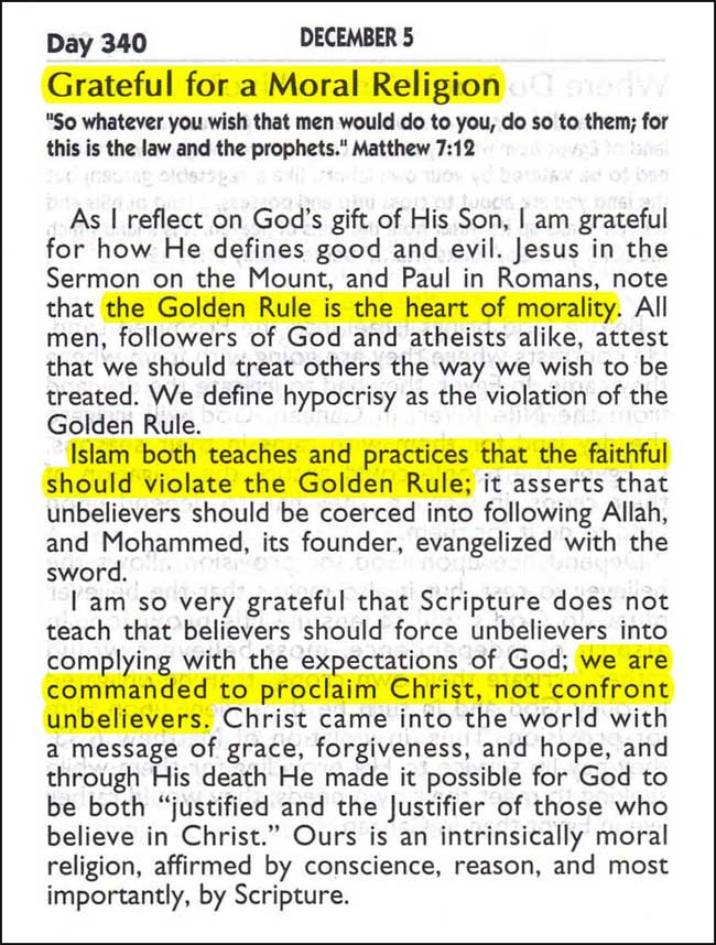“Islam both teaches and practices that the faithful should violate the Golden Rule; it asserts that unbelievers should be coerced into following Allah, and Mohammed, its founder, evangelized with the sword.”